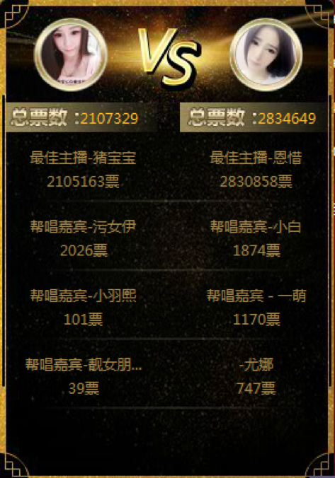 “恩惜”是这场疯狂打赏的女主角之一,为了能够获得这场比赛的胜利,她带来了她的三位帮唱闺蜜助阵,分别是主播“尤娜“”、“一萌”和“小白”,在三位帮唱嘉宾的助力下,恩惜很快获得了粉丝50万张票,真的是人气爆棚。而在“恩惜”帮唱嘉宾表演结束后,另一位主播“猪宝宝”的闺蜜们也毫不示弱,为她们的姐妹进行拉票,靓女朋友组合、“污女伊”和“羽熙”的性感表演获得了几十位用户的疯狂投票,票数迅速接近对手恩惜,比分一度追平! 眼看着自己支持的主播票数被追上,“恩惜”的粉丝们一下子坐不住了。此时,一位用户“凝眸驻惜”怒砸200万投票支持。面对着来势汹汹的挑衅,“猪宝宝”的粉丝没有因为对面的强势表现而有所退缩,用户“龙哥哥”为猪宝宝强势撑腰,怒刷60万票。粉丝“拆迁办”也刷出了150万票,选票像排山倒海一样变成猪宝宝的头像票,闪亮直播间每一个角落。
