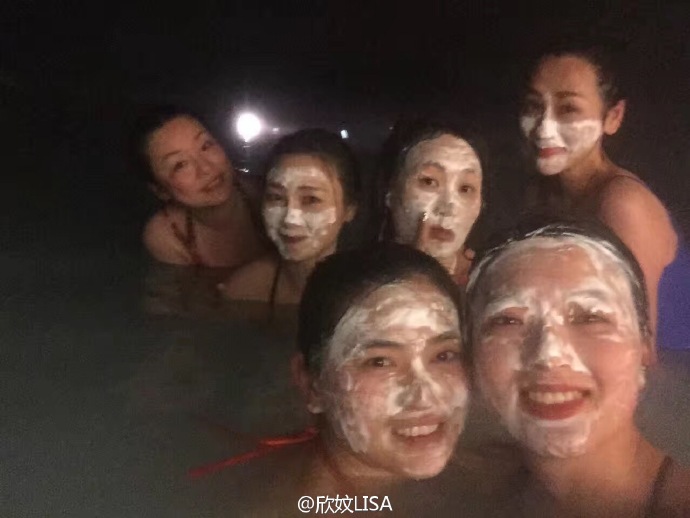 她与友人涂上火山岩面膜,直赞蓝湖是“天然美容院”。