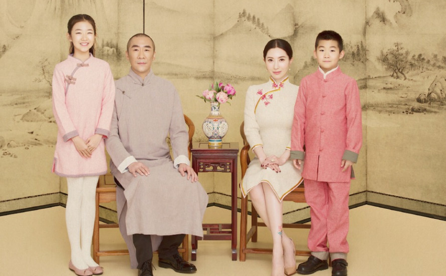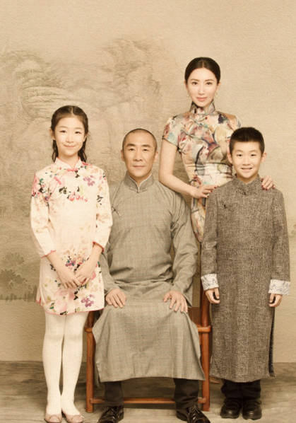 照片中,殷旭穿着旗袍勾勒出优美的身姿,而女儿笑眼弯弯,一副乖巧甜美的样子,儿子也十分帅气。