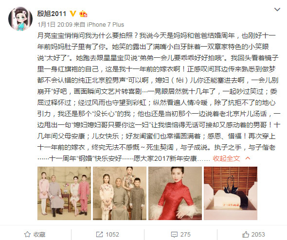 1月1日是章子怡哥哥嫂子结婚11周年纪念日,晚上章子怡的嫂子殷旭发长文感慨“死生契阔,与子成说。执子之手,与子偕老”这样的誓言,还晒出了全家福。