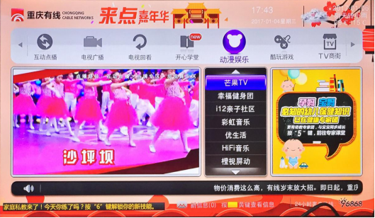 2016年12月14日,芒果TV与重庆有线携手打造的“芒果TV专区”在重庆有线正式上线。芒果TV凭借自身优质内容为重庆的电视观众量身定制了视听专区,为重庆有线的发展注入更多新活力。