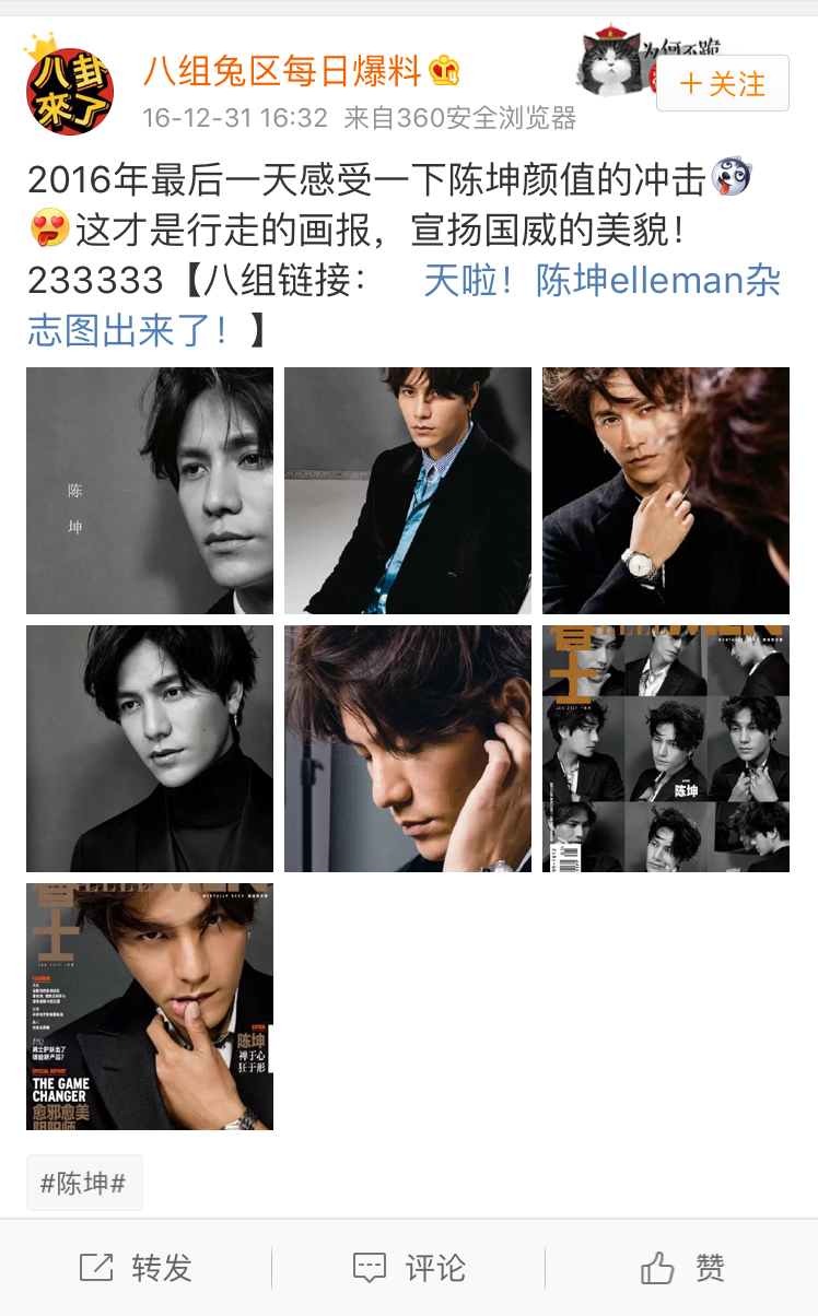 近日,知名演员陈坤曝光了一组为某杂志拍摄的封面大片,为2017一月开年封增添一抹亮色。在这组照片中,陈坤身穿黑色质感西装搭配当下流行的高领毛衣,眼神忧郁尽显绅士气质。在另一套LOOK中,他以一袭羊毛法兰绒宽条纹西装出镜,冷峻不羁的神情为其增添了几分质感男神独有的优雅与从容。本次颇有特点的九宫格封面中,陈坤以全方位视角诠释“行走的画报”,获网友称赞“宣扬国威的美貌”,每一帧都耐人寻味。
