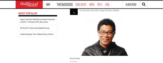 《好莱坞报道》的榜单简介中显示:“王中军与王中磊兄弟二人建立了中国国内第一家民营影视制作公司。时至今日,华谊兄弟传媒集团已经成为中国电影、娱乐界巨头。王中军走国际化路线的决心坚定,华谊兄弟于2015年和美国STX公司签署了18部影片合作协议,成为第一家参与全球收益分账的中国公司。”