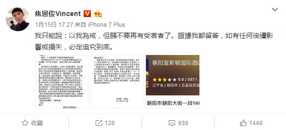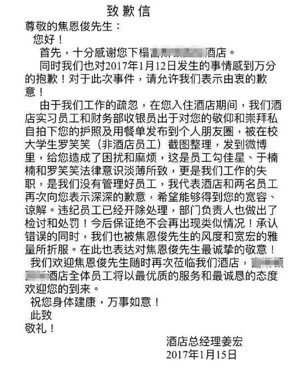 焦恩俊PO文写道:“饭店最基本的是保护旅客的个人隐私,旅客入住登记身份证,不是随便因为你喜不喜欢,崇不崇拜就可以公开炫耀的,这是触法的行为,请不要再当法盲了。”而饭店总经理立即写信道歉,2名违规员工已经被开除,相关主管也以记大过惩处。