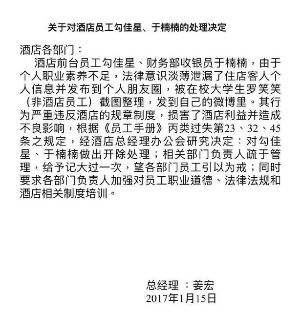 酒店处理决定