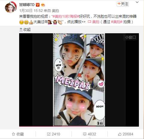 甘婷婷微博发美拍10秒海报,不洗脸引热议