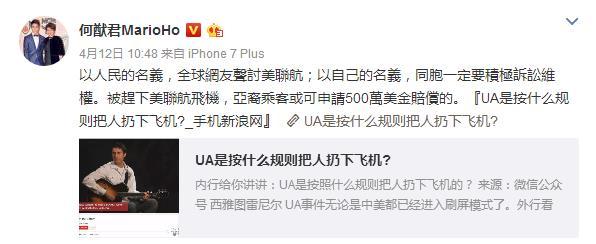 “美联航华裔乘客遭强行拖拽下机 ”事件造成的影响还在持续发酵。近日,何猷君微博发文:“以人民的名义,全球网友声讨美联航;以自己的名义,同胞一定要积极诉讼维权。”