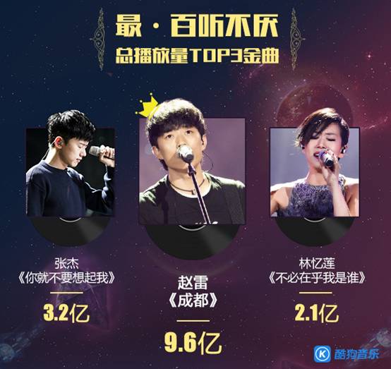 据酷狗音乐大数据显示,赵雷的歌手现场版《成都》,累计播放量高达9.6亿次,一举打破了上季苏运莹的《野子》在酷狗平台创下的3.02亿单曲累计播放量纪录。