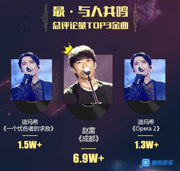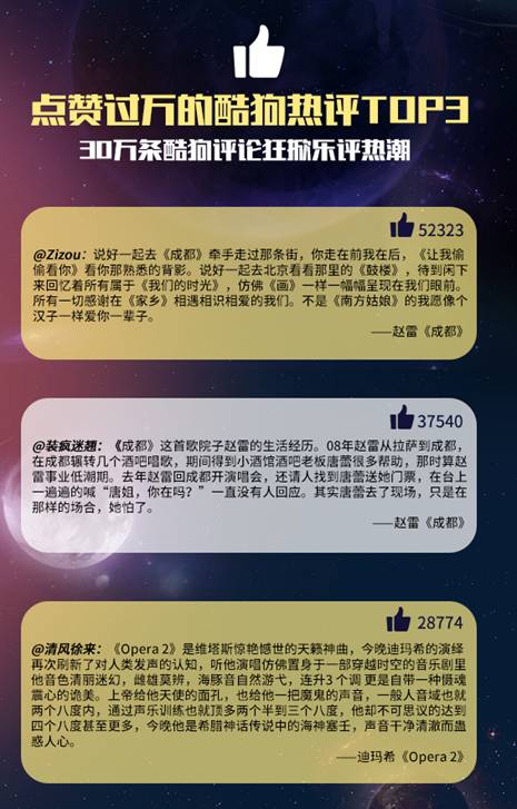 说到酷狗评论最多的《歌手》歌曲,依然是一听就勾起满满往事的《成都》,评论总数高达7万。若按平均一条评论50字计算,酷狗网友已经为赵雷的歌手版《成都》写完了“中国四大名著”。