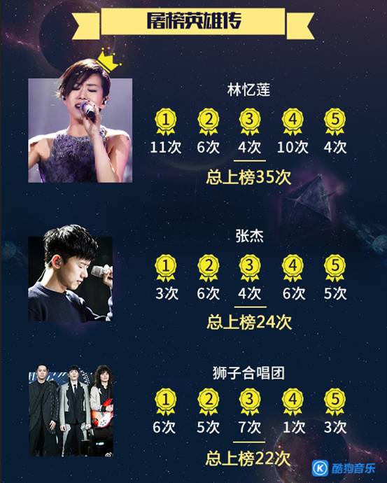 林忆莲除了是本季《歌手》歌王之外,她在酷狗“音乐江湖”上还有另一个“号”,人称“最强屠榜英雄”。演绎竞演歌曲13首,斩获“酷音乐流行榜”、“酷狗飙升榜”、“酷狗音乐风向标”等榜单就达35次!