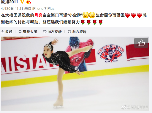 演员殷旭(就是《芈月传》里的卫良人啦)的女儿“小月亮”就在学习花滑。小月亮参加过不少花样滑冰的比赛,并多次获奖,堪称女版“冰上的尤里”!除了月亮之外,殷旭还有一个儿子叫小星星,是北京市青少年冰球联赛的主力队员之一,表现也是非常亮眼!