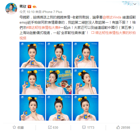 据了解,这款蒋欣专属emoji表情来自蒋欣自己的创作灵感,并由emoji最终设计,首发于维达超韧中国行(第五季)的启动仪式。活动现场发布了一段蒋欣模仿各种emoji表情的独家视频,视频中蒋欣邀请现场观众和广大网友,一起参加“维达韧性表情包大赛”。