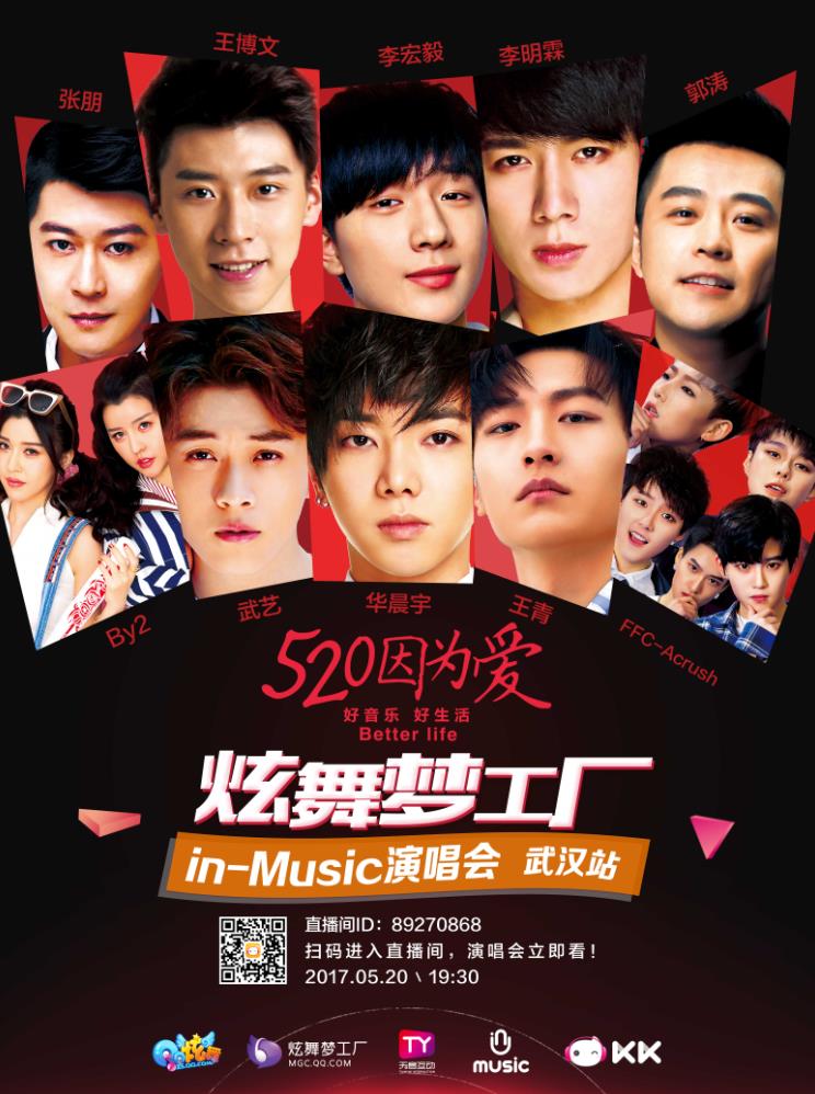 5月20日,由炫舞梦工厂与天音互动联袂打造的in-Music“因为爱”演唱会即将在武汉华中科技大学光谷体育馆甜蜜开唱,华晨宇、王青、武艺、李宏毅、王博文、李明霖、By2强大的明星阵容倾情加盟,KK89270868直播间全程在线互动直播,520给粉丝一场与偶像的爱之约!