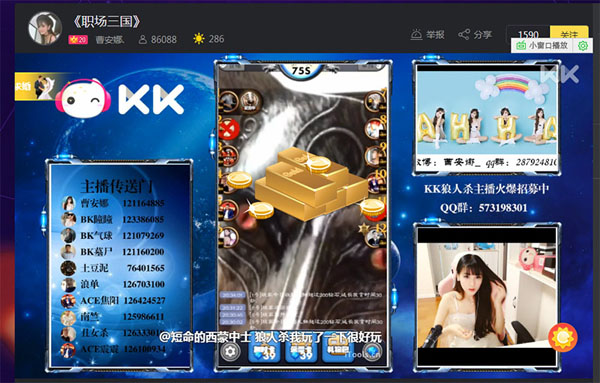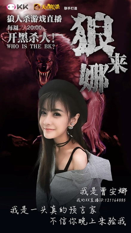 由KK直播与天天狼人杀APP联手打造的大型狼人杀游戏直播节目《狼来娜》已于5月16日20:00正式上线。KK顶级主播、女神曹安娜携手BK顶配玩家气球、瞳瞳及众多素人主播、节目粉丝在线直播开黑,曹安娜的KK直播间一度人气高达13万。