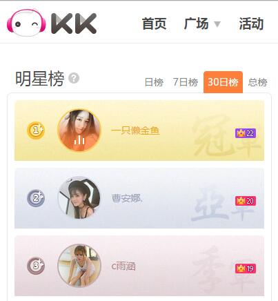 KK平台成立于2012年,是大型成熟娱乐社交视频直播互动平台。截至2016年底,KK平台已拥有独立主播超过10万人,合作家族、公会、经纪公司600余家,注册用户达到1.4亿。作为综合性直播互动平台的代表, KK聚集了大量高颜值才艺达人、网红主播,为用户提供含唱歌、跳舞、游戏、体育、旅游、美食、教育等多领域在内的泛娱乐直播内容。