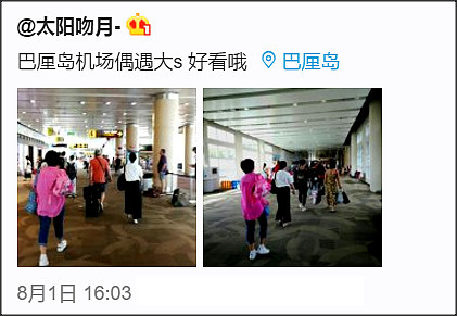 8月1日,有网友在巴厘岛机场偶遇大S带着孩子一家人,并拍下了他们的背影照。从图片可见,身穿白色上衣以及宽松黑裤的大S,看上去有点微微发福。