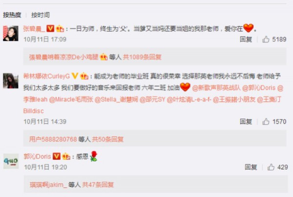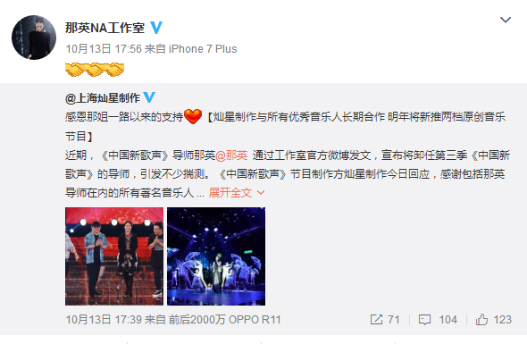 11日,那英通过那英工作室官方微博发出声明,宣布自己将卸任第三季《中国新歌声》导师,历届“小二班“学员们张碧晨、周深、夏恒、汪晨蕊、郭沁、希林娜依·高等纷纷转发留言。张碧晨在微博下暖心评论:一日为师,终身为”父“,当爹又当妈还要当姐的我那老师,爱你在心。周深也留言感谢师恩:“老师,辛苦了”。刚刚毕业的第二季“新歌声”学员郭沁、希林娜依高也纷纷留言:“能成为老师的毕业班,真的很荣幸。”