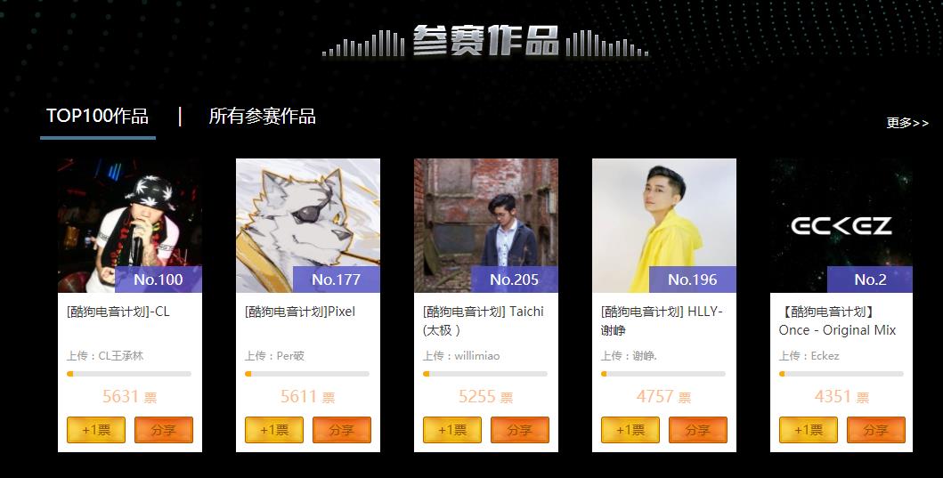 目前,经过专业评审的严格筛选,本次酷狗电音计划的Top100作品已经热辣出炉。进入最后Top100的作品,均是得到了国内外电音大咖评审的认可,本年度最好的电音作品。