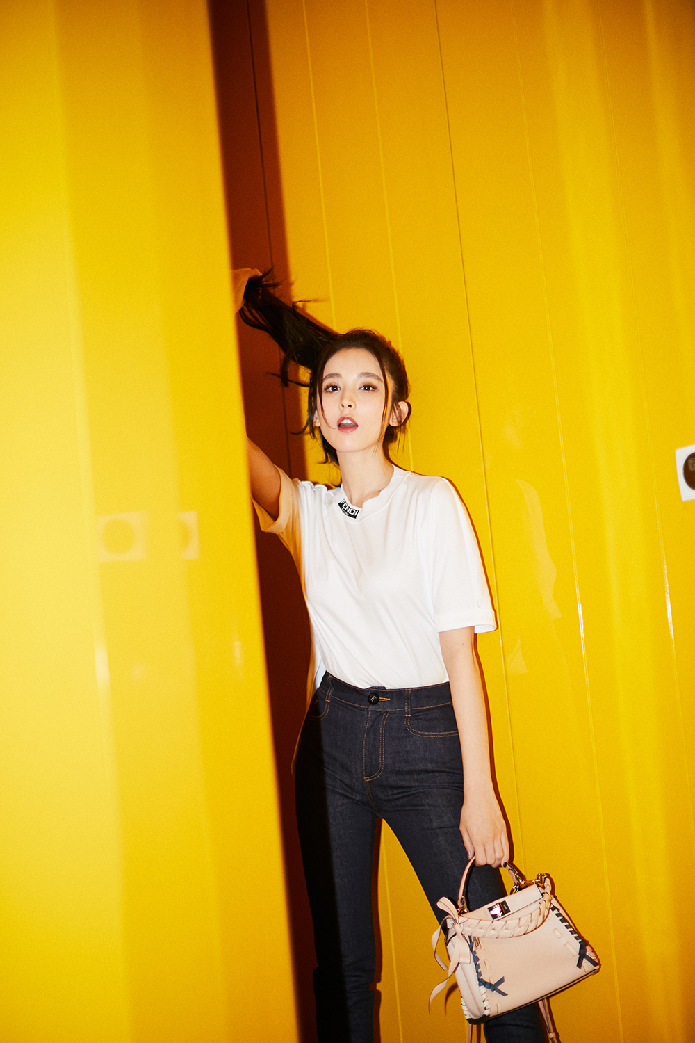 精选的配件给整体造型增添风采,裸粉色的袜靴衬出娜扎纤细的大长腿,裸色手袋优雅大气,绑带装饰清新别致,细节中打造优雅女神范儿。