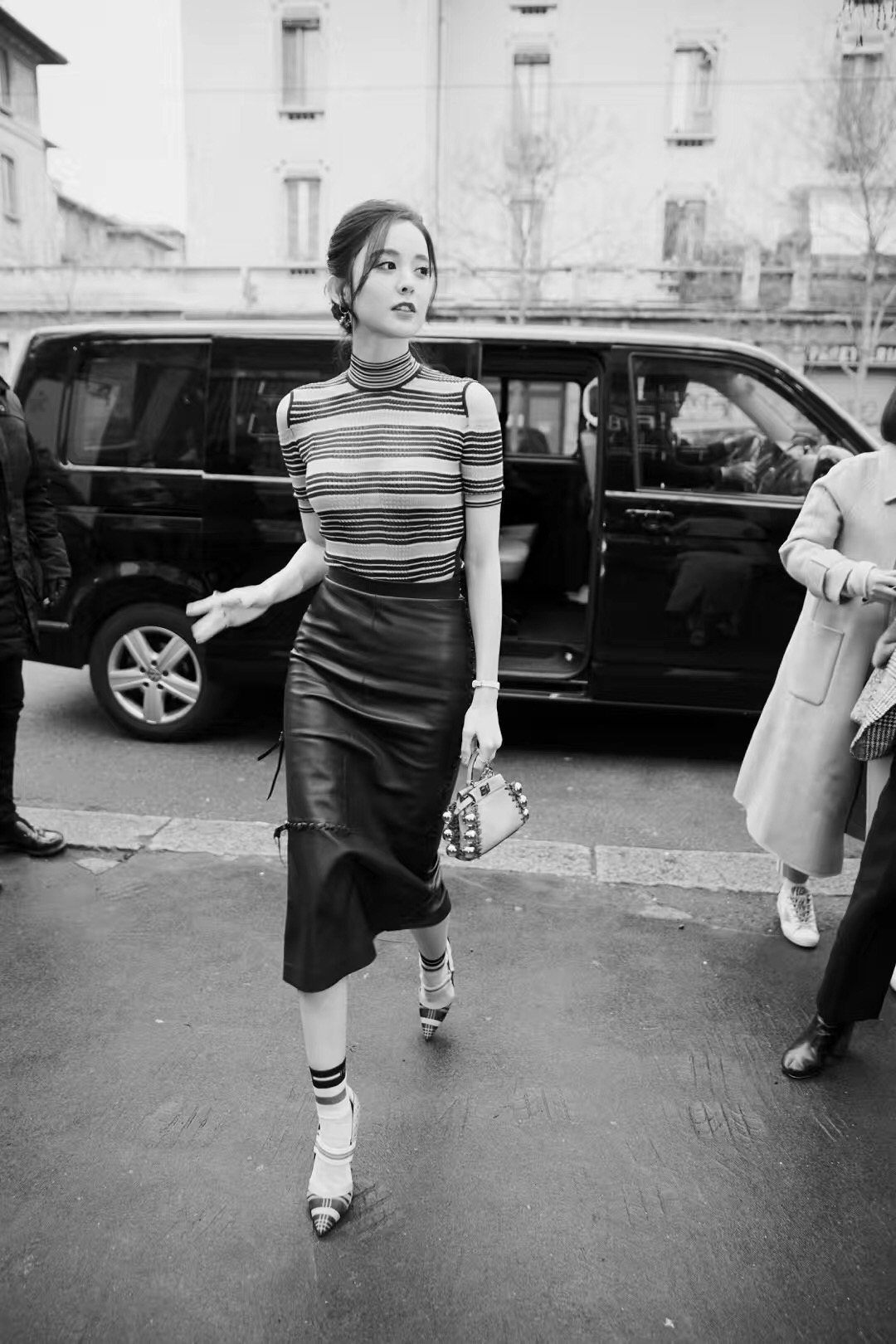 FENDI看秀,娜扎挑选了条纹露肩针织衫搭配黑色皮裙勾勒出完美曲线,玩起性感轻熟风。修身的造型优雅别致又夹杂一丝复古韵味,优雅chic,风韵十足。