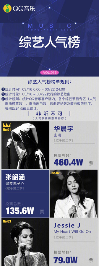 看看上周QQ音乐综艺人气榜,华晨宇、张韶涵、Jessie J三位实力唱将凭借各自的精彩表现,征服了众多网友,获得了迅速高涨的投票数量,人气之爆可见一斑!这些人气歌曲也在QQ音乐《歌手》专区获得了广大听众的海量收听和评论,高品质音乐让听者如临现场,如痴如醉。