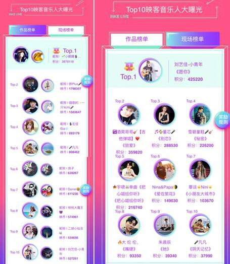 本次《映客音乐人计划》分为作品打榜和现场打榜两种形式,成功吸引到包括主播、独立音乐人在内的百位音乐人加入。网友可通过登陆、互动、打赏等方式,为自己喜欢的音乐人投票打call。截至7月17日,根据有效票数对应的积分和直播收益成绩,2组Top10原创音乐人脱颖而出。刘艺佳的《愿你》、橄栋的《致爱》、董芯的《别恋》分别位居作品榜单前3,而@小眼睛Elsa、@胖plus、@一只YOYO 则分别获得现场榜单前3名,其中@小眼睛Elsa 拿下3878118积分,创下了本次活动最高记录。