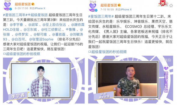 从6月25日发布第一弹明星庆生视频至今,超级星饭团的生日月企划已经悄然过去一个月,在此期间,三百余位明星陆续送上祝福,百余家粉丝站紧随其后,更有业界大咖前来助阵,轰动粉丝圈。除此之外,更有多个品牌蓝V联动打call,送上福利,如此攻势下,星饭团三周年的微博话题阅读量更是在短短时间内迅速突破6亿。为了表示感谢,超级星饭团也特别推出了定制周边礼包回馈明星和粉丝们。