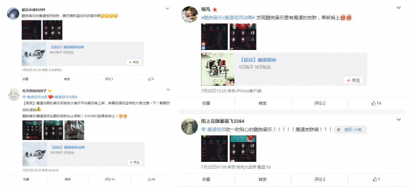 许多酷狗歌友在使用这款皮肤后都主动将使用体验分享到#魔道祖师动画#微博超级话题上,好评如潮。