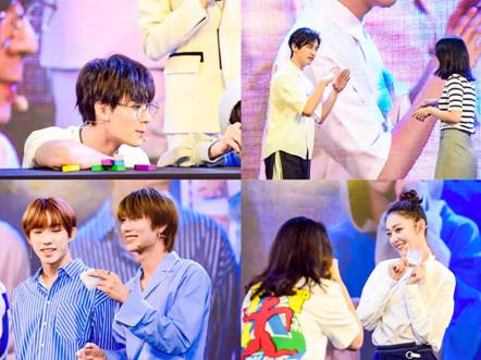 李希侃、郑锐彬与粉丝组队搭积木,不仅要和粉丝一起出谋划策,还要“调皮”地干扰对家;徐圣恩、周彦辰在粉丝的指挥下蒙眼夹泡泡玩偶,“战利品”也亲手送给了粉丝;爱豆粉丝通力合作,用形体表演传递关键词……现场的叠叠乐、传声筒、娃娃机等活动中,粉丝和爱豆并肩作战。“Honey Honey”环节,爱豆更为粉丝送上自己亲手制作的蛋糕,一位当日正好18岁的粉丝还收获到了来自周彦辰成人礼祝福。