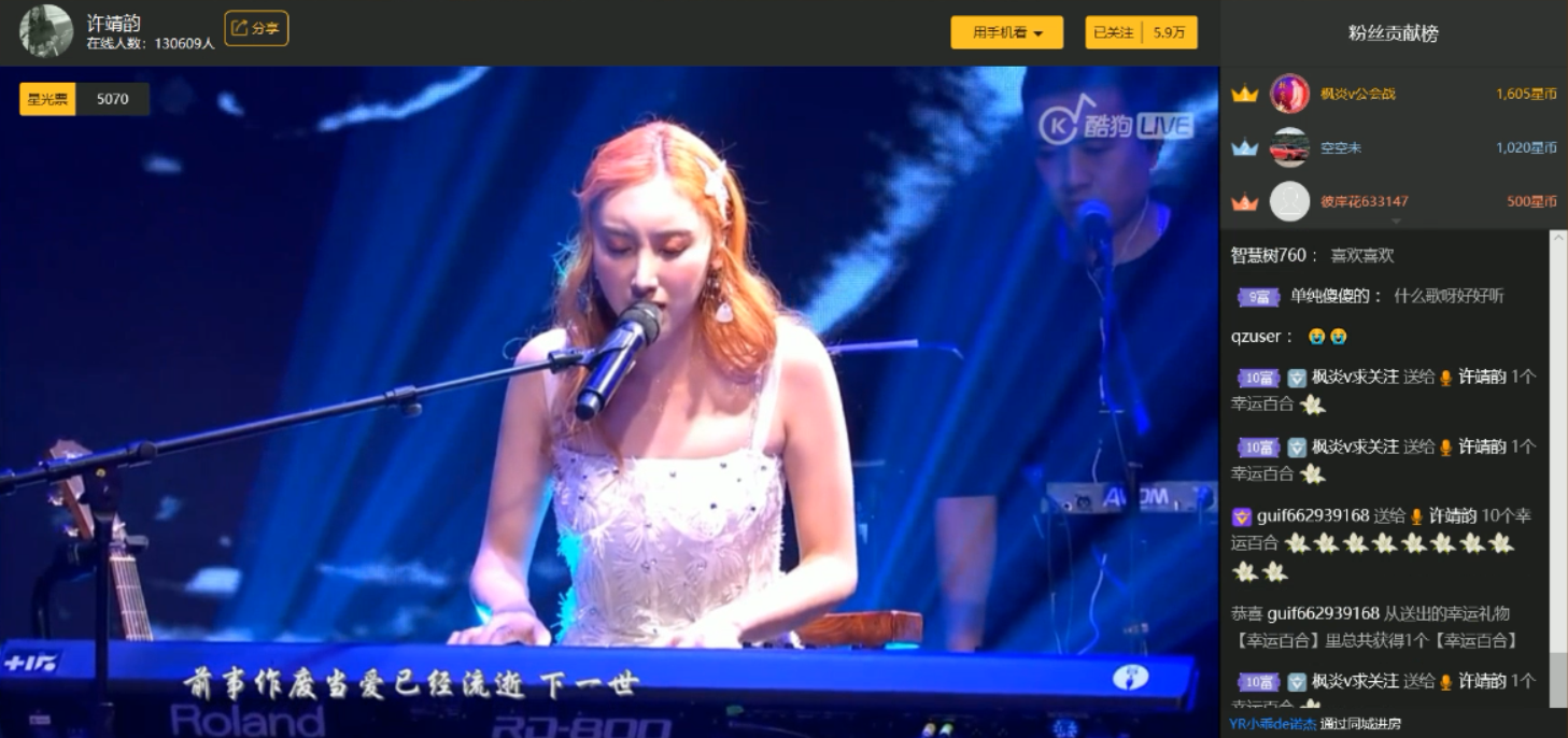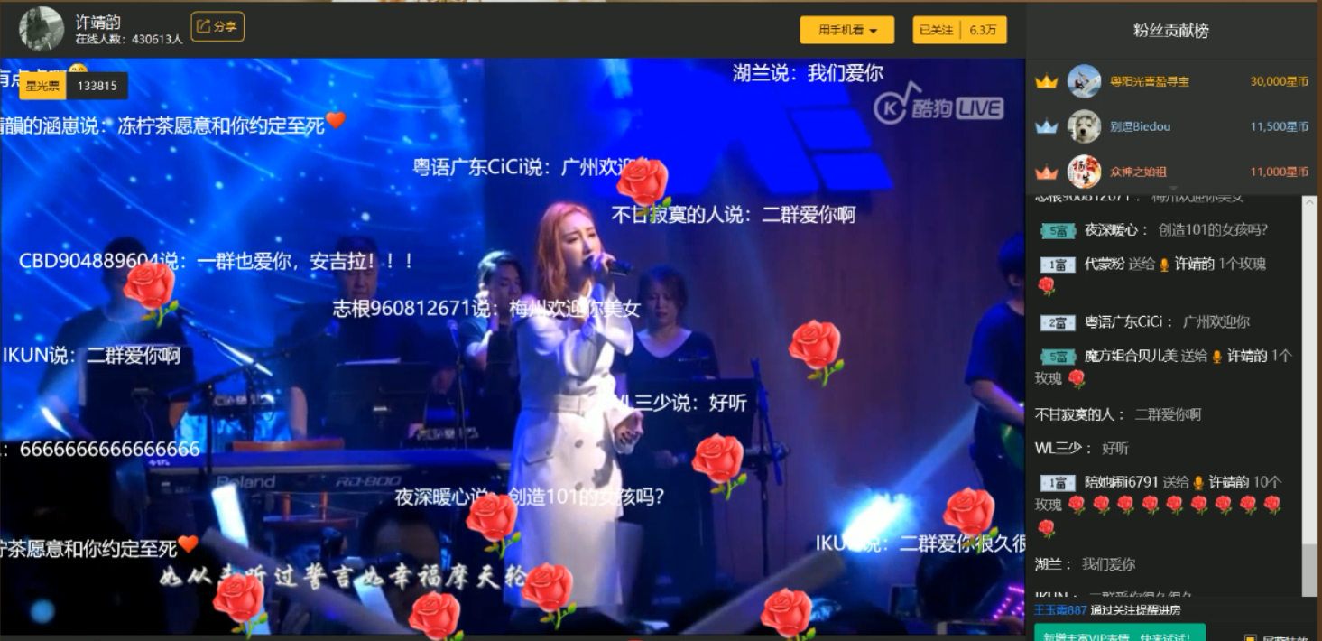 活动刚开始,大屏幕还在播放MV,就已经陆续有11W粉丝进入酷狗直播间,守候颜值与实力并行的许靖韵。伴随着陈奕迅的一首经典的《白玫瑰》,许靖韵一袭白裙边弹边唱,仿似一个仙女一般,出现在舞台之上,酷狗直播的粉丝瞬间“热力值”猛增,开始热情刷屏呼喊。