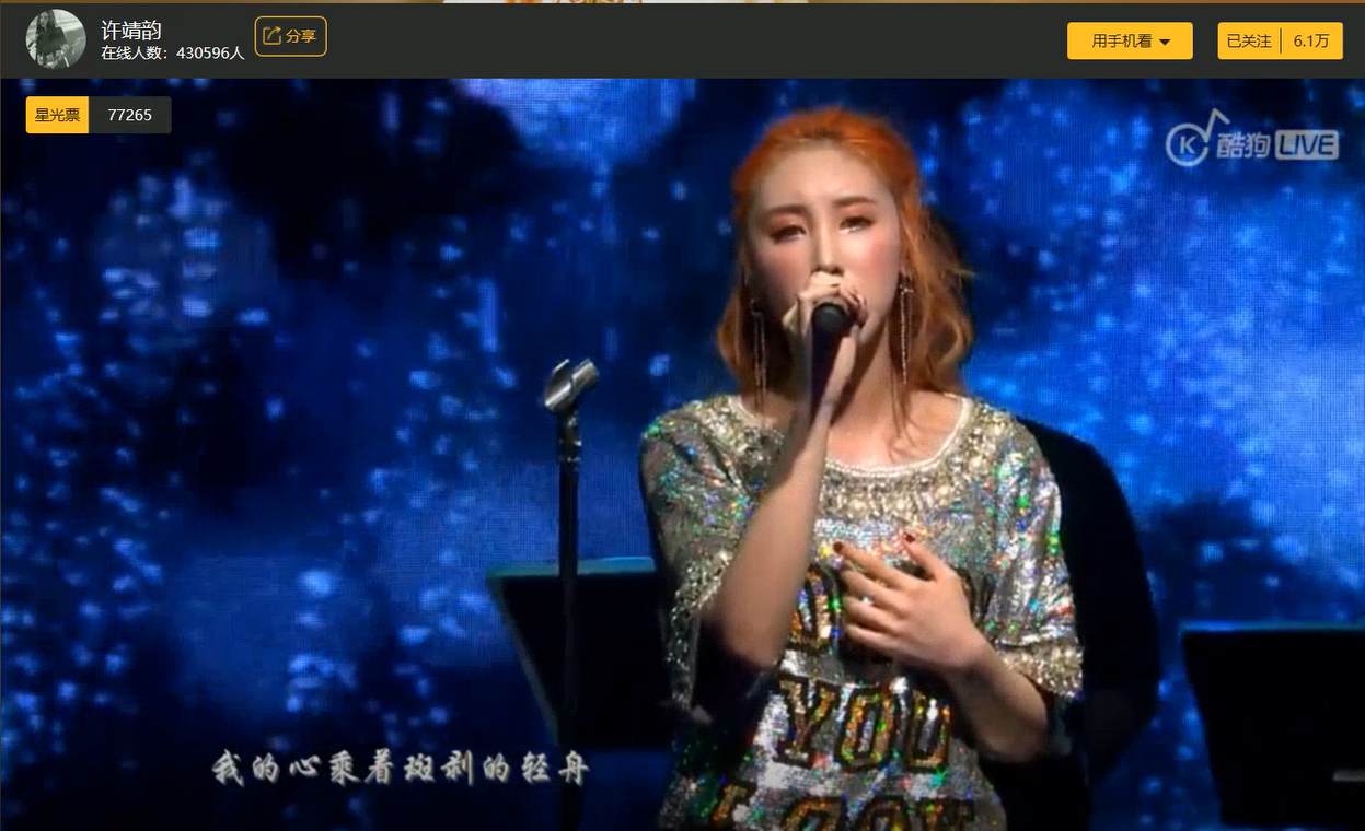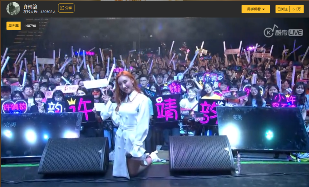 8月8日晚,许靖韵在北京举办了《K歌之王》音乐尊享会,酷狗进行了全程直播。这个港味十足的女孩现场带来多首经典好听的歌曲,彻底引燃现场粉丝热情,同时让酷狗直播的粉丝在线点歌,用实力宠尽线上线下粉丝。在短短一个半小时的时间里,竟然吸引了酷狗43W+粉丝的在线围观,几个平台观看用户突破百万!