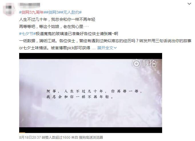 也有来自“剪刀手”的庆生视频,记录在《剑网3》中一场令人伤感的“无人赴约”。