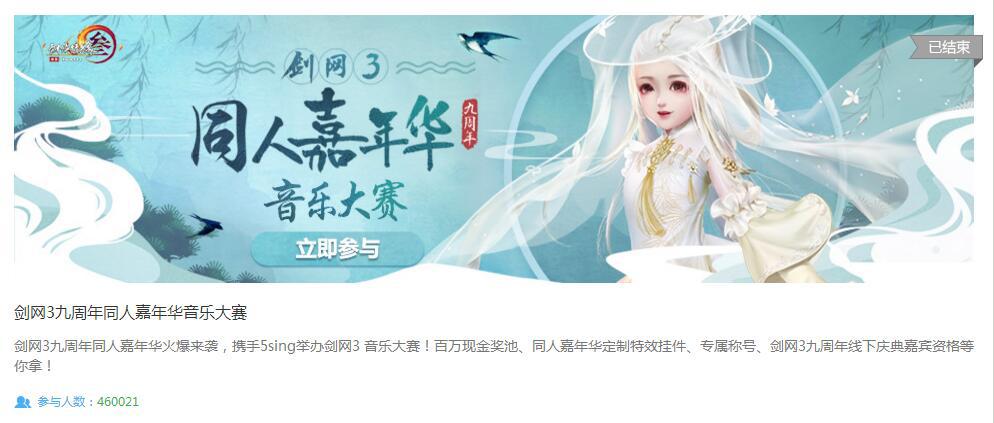 当然,《剑网3》九周年活动除了风景党捏图和剪刀手视频等作品以外,怎么少得了同人音乐呢。所以这次《剑网3》联合酷狗蘑菇在5sing中国原创音乐平台上发起的“剑网3·同人嘉年华音乐大赛”专题活动。
