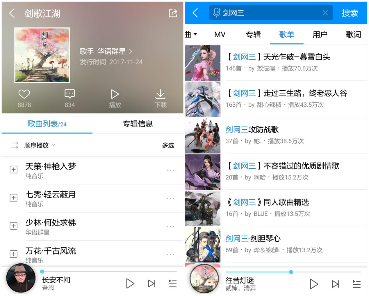 同时酷狗音乐上也有非常多优质的《剑网三》相关歌单以及专辑,以音乐为媒介,带着《剑网3》游戏玩家一起回忆游戏中的点点滴滴。
