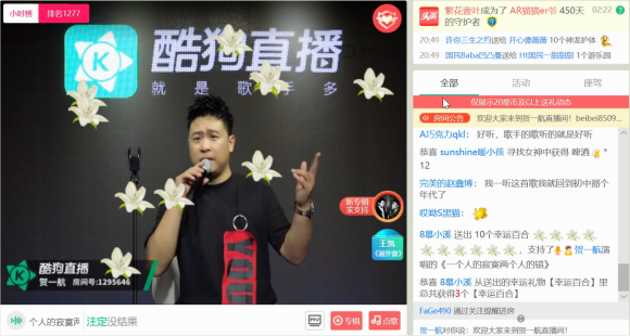 晚上8点半,贺一航准时出现在直播间内,已是酷狗直播间常客的贺一航十分了解观众们的心思,简单跟粉丝们唠嗑了一会,就奉上了暖场歌曲《如果,我》。一曲唱罢,还没来得及喝水休息一下的一航,又在粉丝们的强烈要求下献唱当晚的主打歌《原来占据你内心的人不是我》。