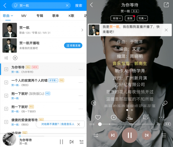 当晚不少粉丝通过酷狗音乐的提示进入直播间,看到贺一航本人在演唱,激动地在评论区留言表示“今天运气不错遇到原唱”。酷狗音乐和酷狗直播互通后,粉丝们有了更多机会和爱豆进行交流,歌手的人气也涨了不少,真要给酷狗点个赞!