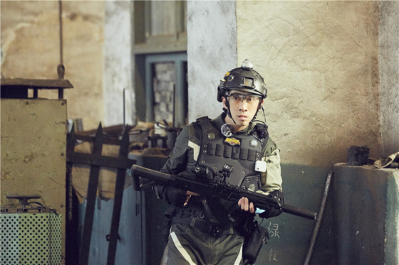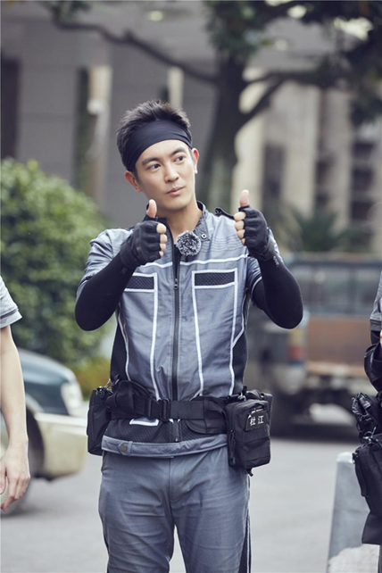 陈汉典手持道具,正歪着身子神情警惕地注视着右前方,不知是否在“勘察敌情”。