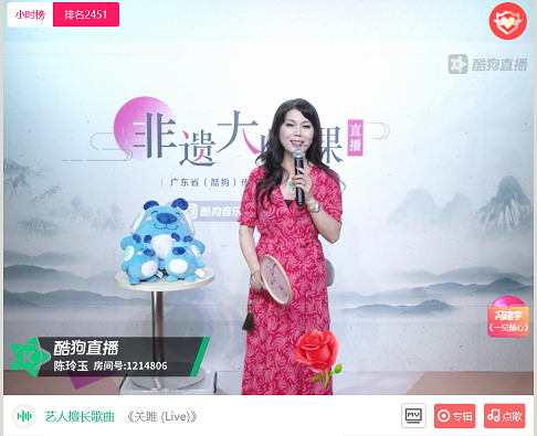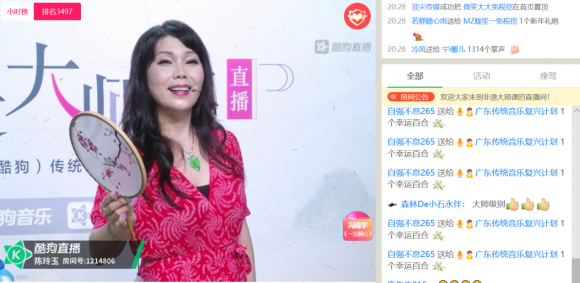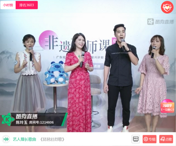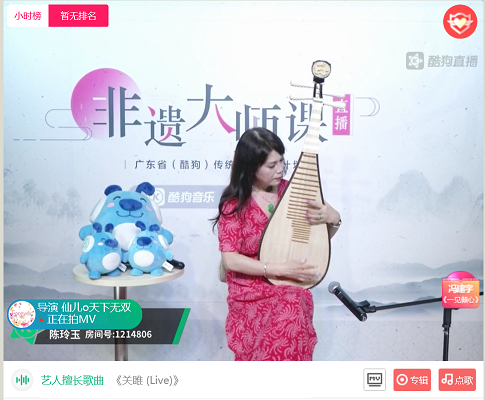 粤曲是由粤剧分支出来的广东省最大的地方戏曲剧种,流行于广东、广西的粤语地区、港澳及海外粤籍华侨聚居的地方。2011年5月23日,粤曲经国务院批准列入第三批国家级非物质文化遗产名录。直播一开始,陈玲玉老师便带来第一首乐曲《欢聚》,这是一首欢快的广东小曲,陈玲玉老师正如歌词“痛饮心情畅”那般,高亢亮丽的嗓子配合声情演姿,唱出欢聚一堂的欢欣畅快。陈老师也说,希望通过酷狗这个平台,大家可以欢聚一堂,寓意十足。