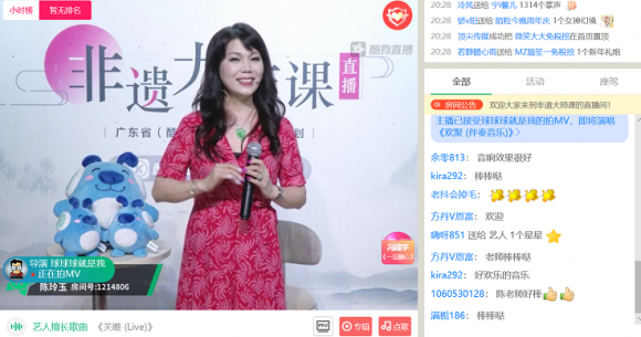 作为非物质遗产的传承人,陈玲玉老师很感谢酷狗直播这个平台,让观众对传统文化有进一步的接触和了解。她也和观众分享了她与粤曲的故事,原来,她已经从事曲艺表演四十一年,从懵懂小女孩年纪便开始在广东音乐曲艺团学艺,经过多年努力成为了国家一级演员。和蔼可亲的陈玲玉老师还在线回答了许多酷狗网友关于粤曲的问题,比如粤曲与现在的粤语流行曲的不同之处、粤曲与粤剧的渊源以及如何练发声等,令观众获益匪浅。