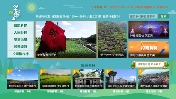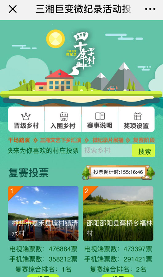 9月10日开始,由芒果TV、湖南移动以及央视爱上传媒主办,湖南都市频道协办的大型互动电视乡村全景秀《三湘巨变微纪录·四十年四十村》复赛晋级投票在湖南移动IPTV电视端、“四十年四十村”活动H5页面以及芒果TV手机端等多个渠道全面展开,随着本周赛程过半,海选入围的四十个乡村的竞争变得愈发激烈,湖湘儿女纷纷为自己的家乡投票加油助威,三湘大地刮起一股全民共赞美好家园的热潮。