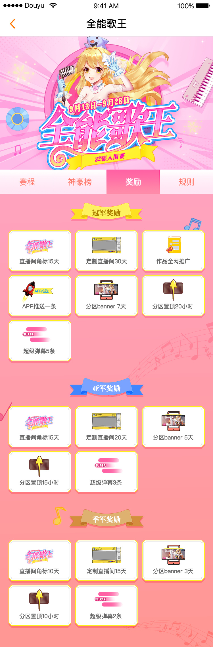 最终拿下冠军、亚军、季军的选手,同样将会拿到斗鱼量身定制的终极大礼,其中包括定制直播间、直播间角标、作品全网推广、APP推送、分区置顶、超级弹幕等等顶级流量资源扶持,再借助斗鱼领先的行业优势,届时成为一位热度百万的大主播将不再是梦想!怀有音乐梦、主播梦的你赶紧来参加吧!