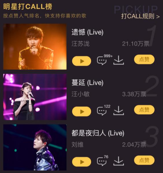 汪苏泷翻唱的《遗憾》一经上线酷狗,就获得众多网友的大力支持,目前在【明星打call榜】上以21万+的支持票数,成为人气最高的歌曲。