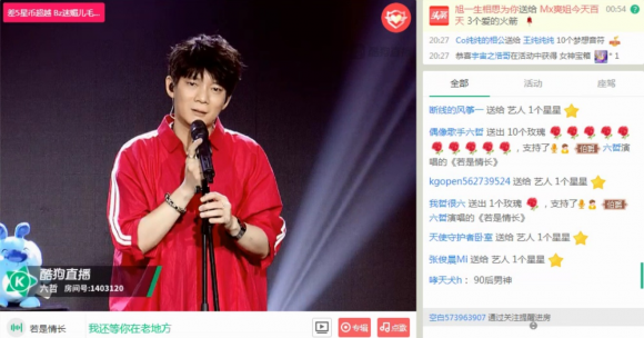 酷狗首唱会来到尾声,粉丝们不舍爱豆离去,纷纷要求安可,六哥也如观众所愿,再度献唱《若是情长》。六哲也向大家承诺,今后会努力再出新歌,争取早日再到直播间和粉丝们互动,而粉丝们也约定好,下次一定会呼朋唤友过来捧场。如果你也想成为六哲直播间的小伙伴,不妨去关注他的直播间,再有首唱会,就能到直播间和他一起互动啦!