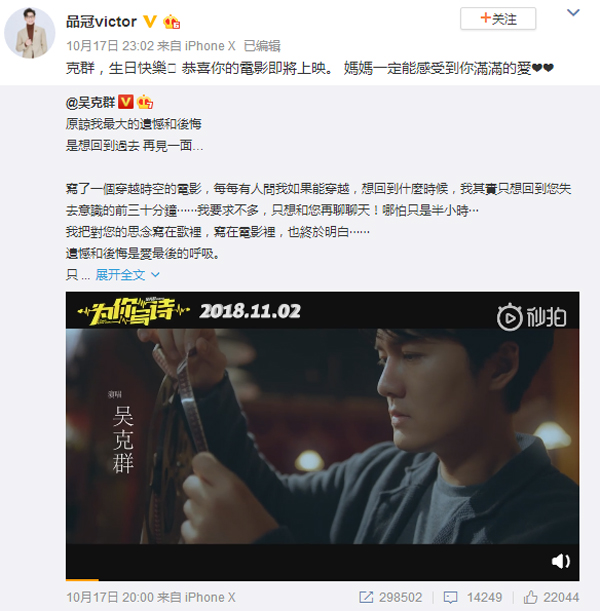 10月17日,也就是品冠来格乐利雅海岛婚礼节前10天,曾在微博上与好兄弟吴克群互动,祝福吴克群生日快乐,恭喜吴克群《为你写诗》电影上映,并转发了吴克群的电影预告视频,吴克群微博及时回复“谢谢哥,感恩有你的祝福