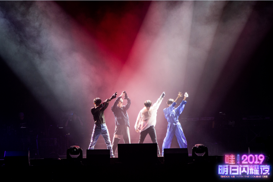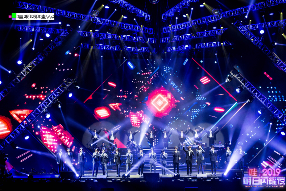 在新旧交替之际,哇唧唧哇集结明日家族,举办了一场以“shock me with the coming one”为主题的跨年演唱会,以 high翻炸裂的现场表演奏响新年序曲。演唱会上,两季《明日之子》的各大厂牌酷炫登台,以《卡路里》mix《如果有一天我变得很有钱》热力开场,“小可爱”斯外戈的一句“燃烧我的卡路里”重新演绎2018年度神曲,酷中带萌贡献超燃现场。马伯骞、周震南、斯外戈、邓典四位明日家族中的节奏担当,则通过力量感十足的团舞震慑全场,宣告演唱会第一篇章“节奏闪耀”的完结。