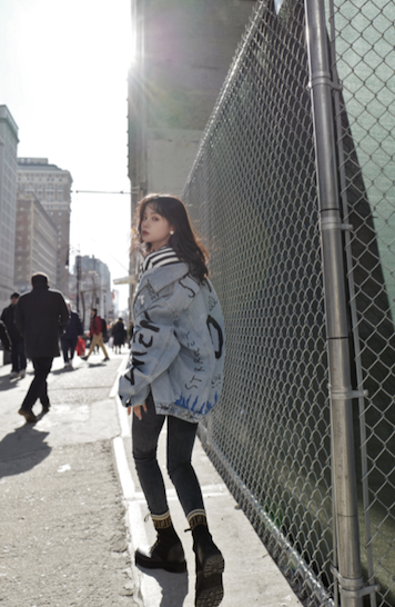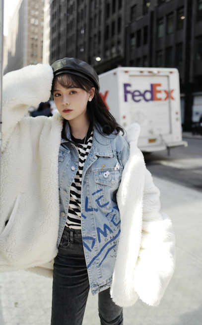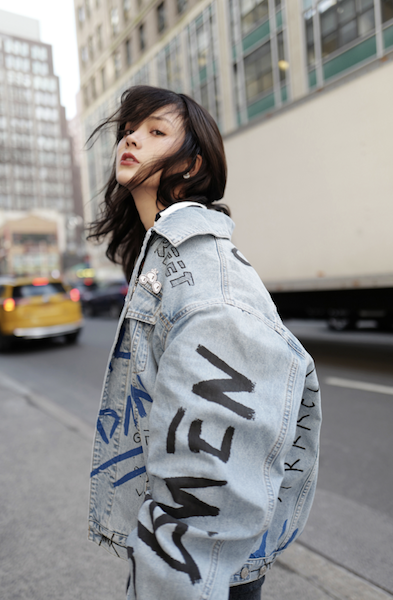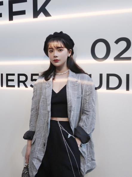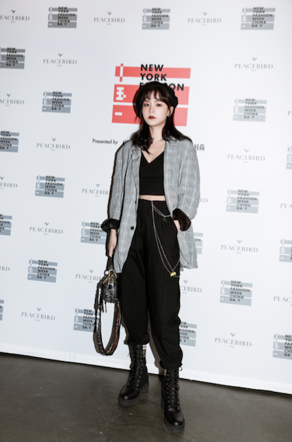 此次洪潇亮相的是太平鸟品牌男装发表会,她也以一身男友风look亮相。廓形简洁的灰色休闲西装内搭黑色露脐低胸吊带,既帅气又性感。宽松西装袖口随意挽起,更添一丝随意潇洒的气质。下穿黑色束脚工装裤,配上一双“硬核”皮靴,再搭配黑色贝雷帽,整套造型英气十足,潮范儿不减。而在街拍中,洪潇又以横条纹上衣搭配牛仔外套现身纽约街头,阳光下尽显灵动。
