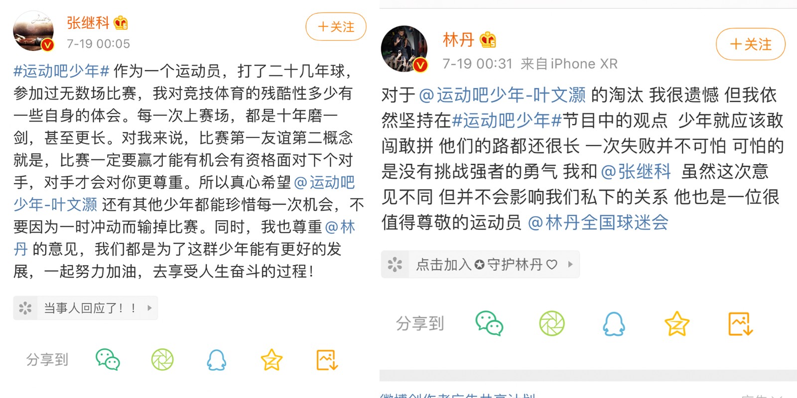这次争执火药味很足,当时不仅引起了外界针对两位冠军私下关系的猜测与好奇,甚至有观众表示“难道制造矛盾又不解决就是综艺的套路吗”?然而在这次“冠军之争”上,《运动吧少年》再次完美地交出了答卷:节目播出后不久,张继科、林丹两人分别发文,堪称“握手言和”,仔细品读两位冠军的发言,我们不难发现整档节目的精神核心:和,而不同。或许两人对竞技的观念不同,但却对少年有着同样的期许。在这个舞台上,包容和真实才是永恒的主题。